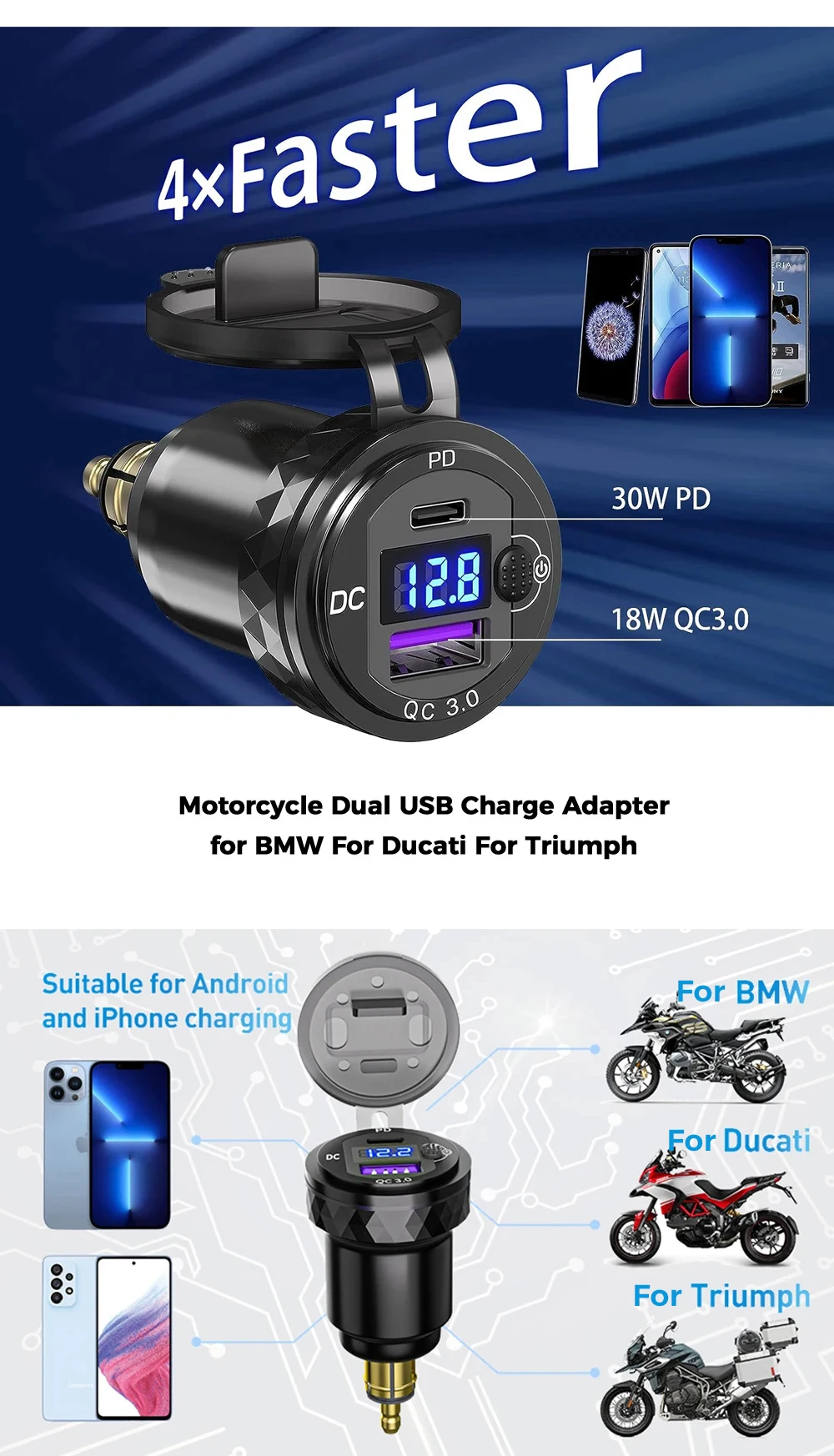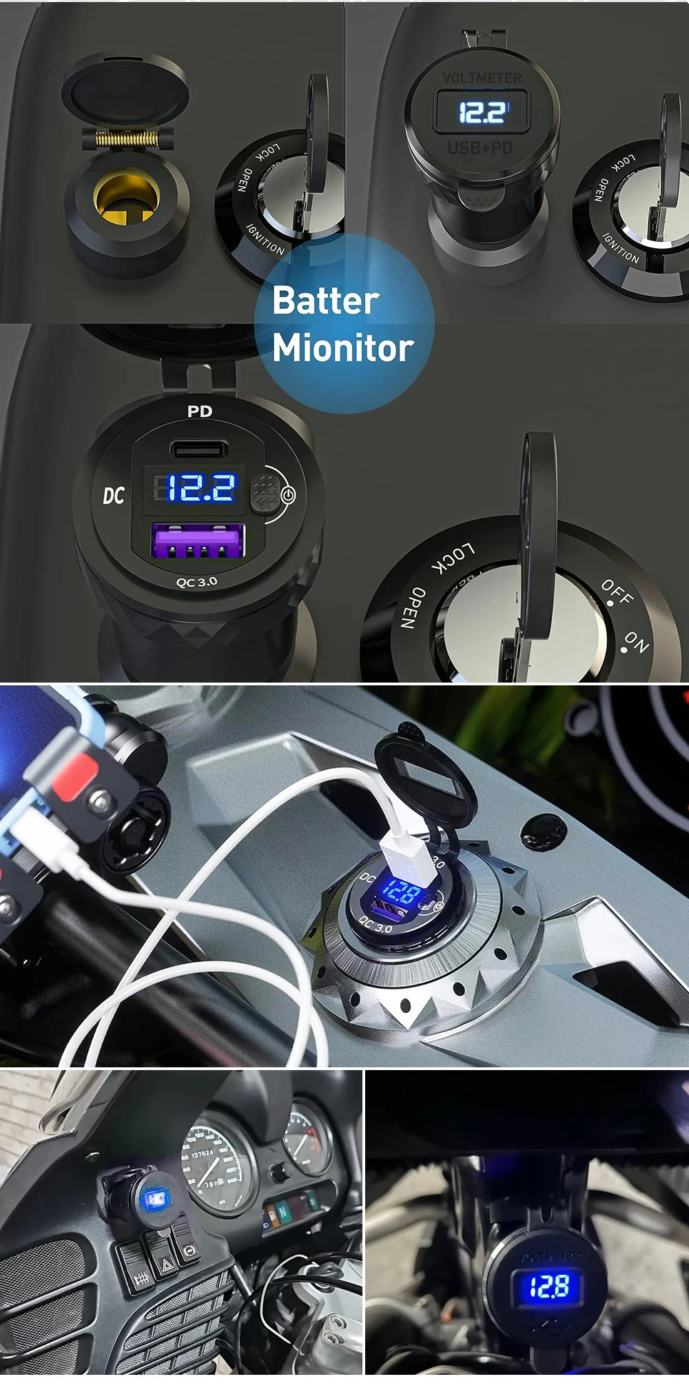 【Digital Voltmeter Display】- Built in intelligent voltage monitor, with LED digital display, it real time shows you the accurate voltage status of motorcycle, more secure for driving.