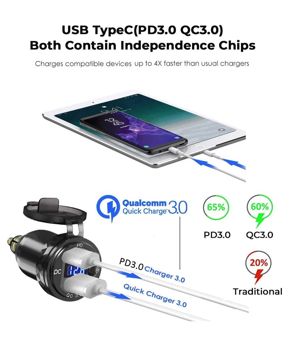 DIN Hella Plug 3.0 Dual USB Quick Charger Type C LED Digital Display Adapter Aluminum Alloy European Motorcycle USB Charger Din Socket Plug Power Outlet Voltmeter for BMW For Ducati For Triumph/Phone/iPhone/GPS/Satnav