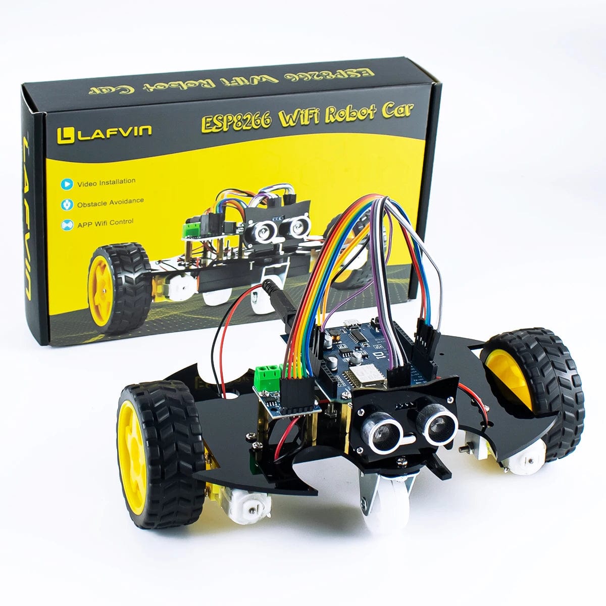 1. The kit uses ESP8266 D1 WiFi R3 as the controller, and is equipped with L9110S motor driver and ultrasonic ranging module. Connected to wifi, you can control the robot car to move forward, backward, left and right through the mobile APP, giving you a new control experience.