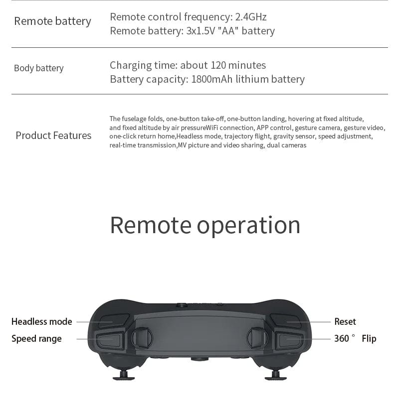 Up/down, Forward/backward, Turn left/right, Sideward flight, 3-level flight speed, LED Light, Headless Mode, One Key Automatic Return, Altitude Hold Mode, WiFi FPV, Trajectory Flight, Camera/Video