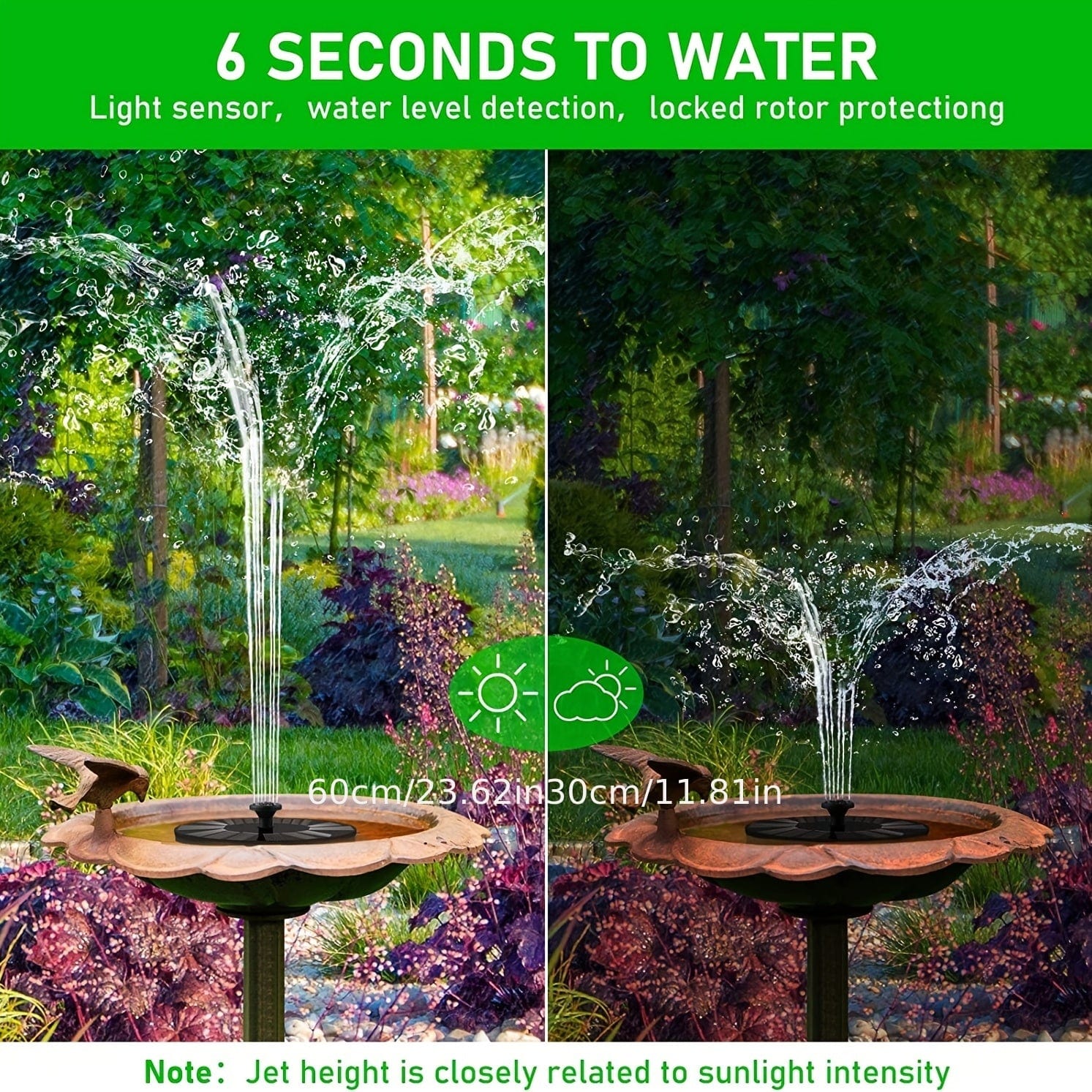Solar powered fountains are equipped with six nozzles, each of which can produce different effects. The height can be adjusted through the nozzle to prevent splashing out of the basin and effectively utilize water sources.