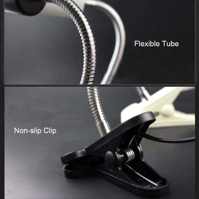 light holder with strong clamp-on clip, and flexible tube can adjust freely, focus light and heat to desired spot.
