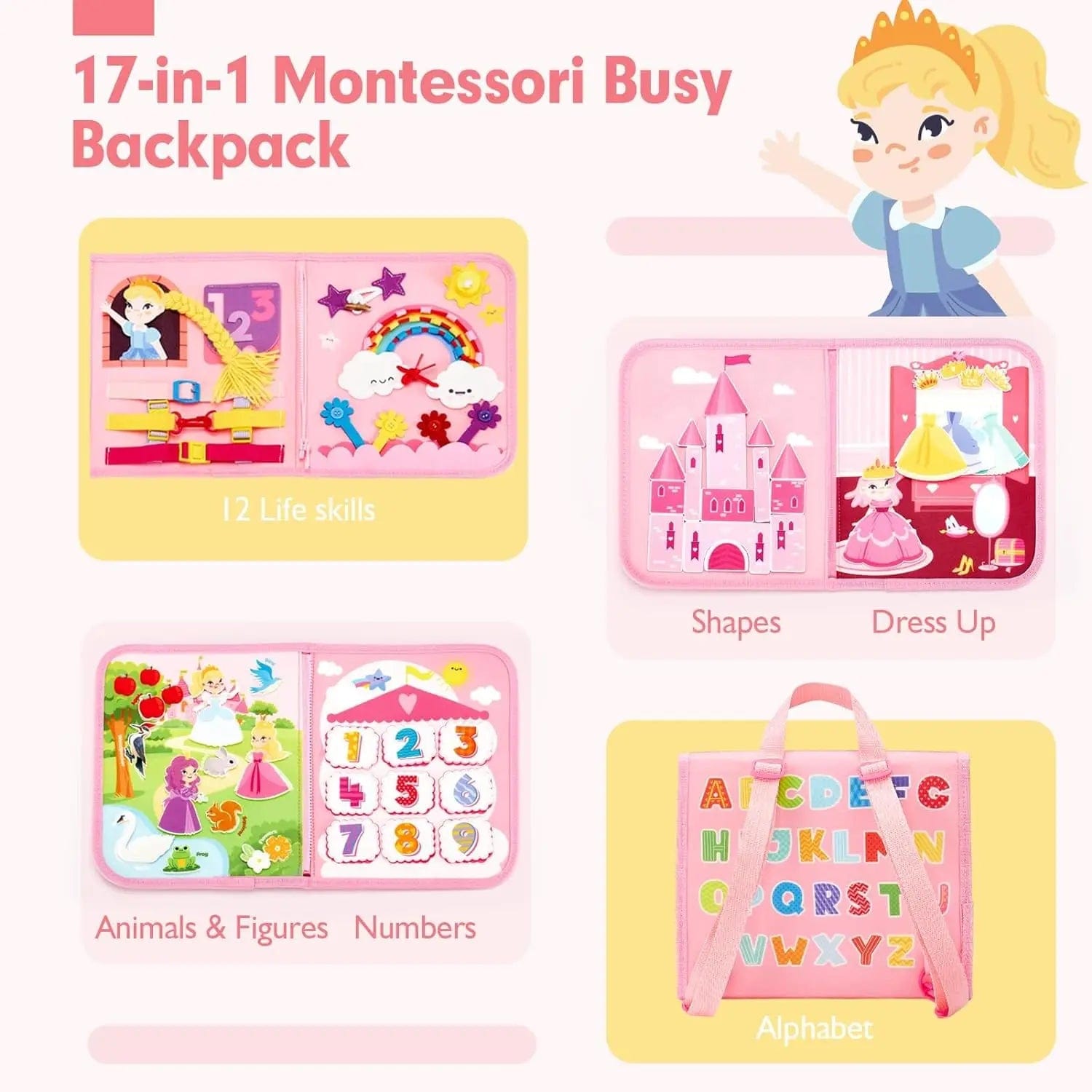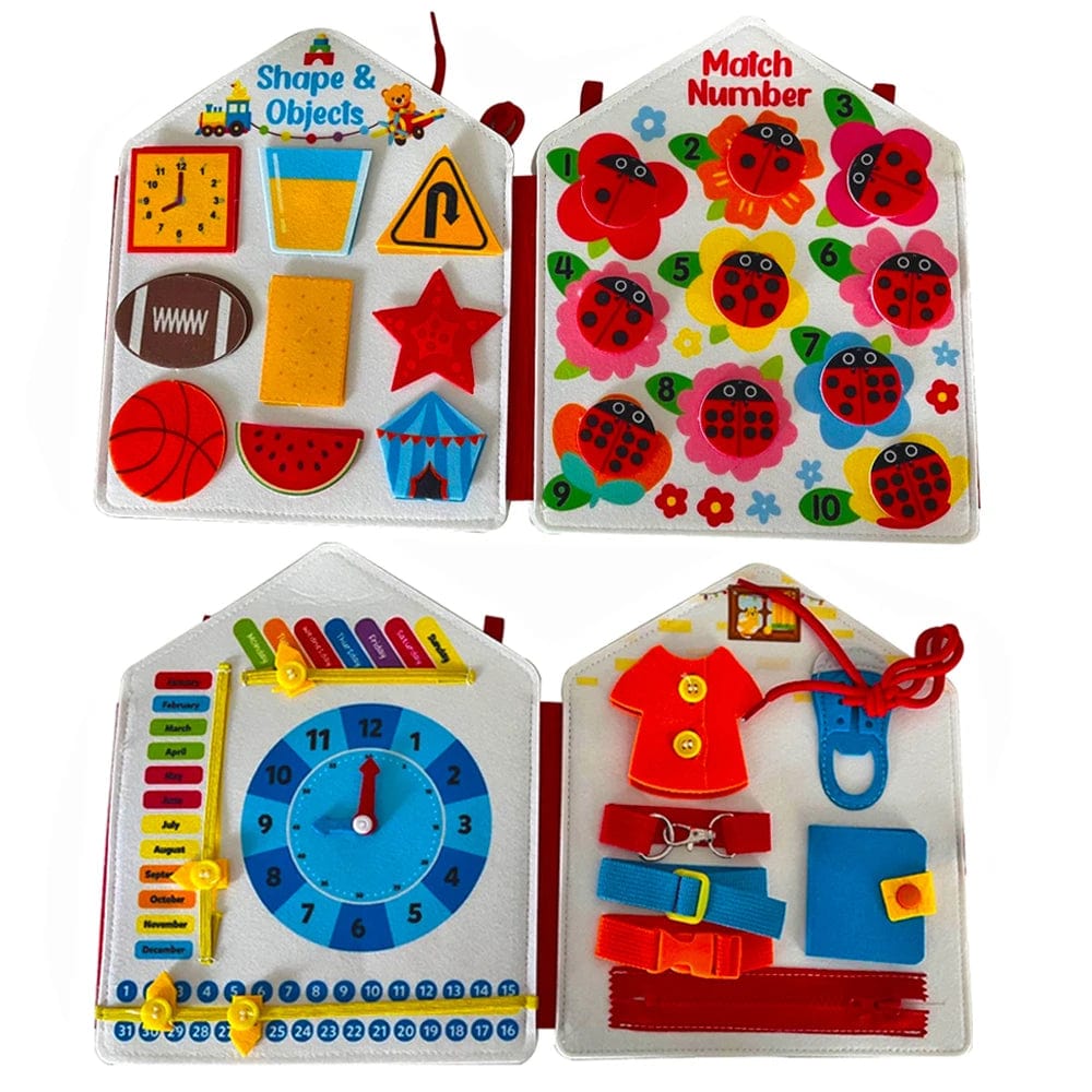 Combining Montessori principles with fun, our Busy Board teaches toddlers how to dress, button, and tie their shoes. From "Braid Hair" and "Screw the Bottle Cap" "Shoelace" and a " Mirror,"Coupled with sorting and matching skills for numbers, shapes, and more, your little one will develop fine motor skills and hand-eye coordination, all while having a blast. This Busy Backpack isn't just a toy; it's a doorway to learning and fun.It is a perfect learning and educational toy for toddler.