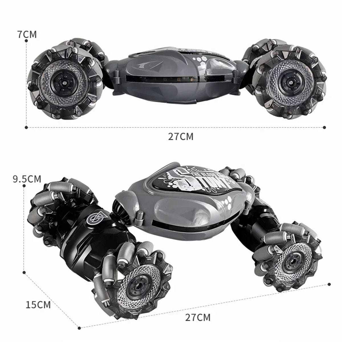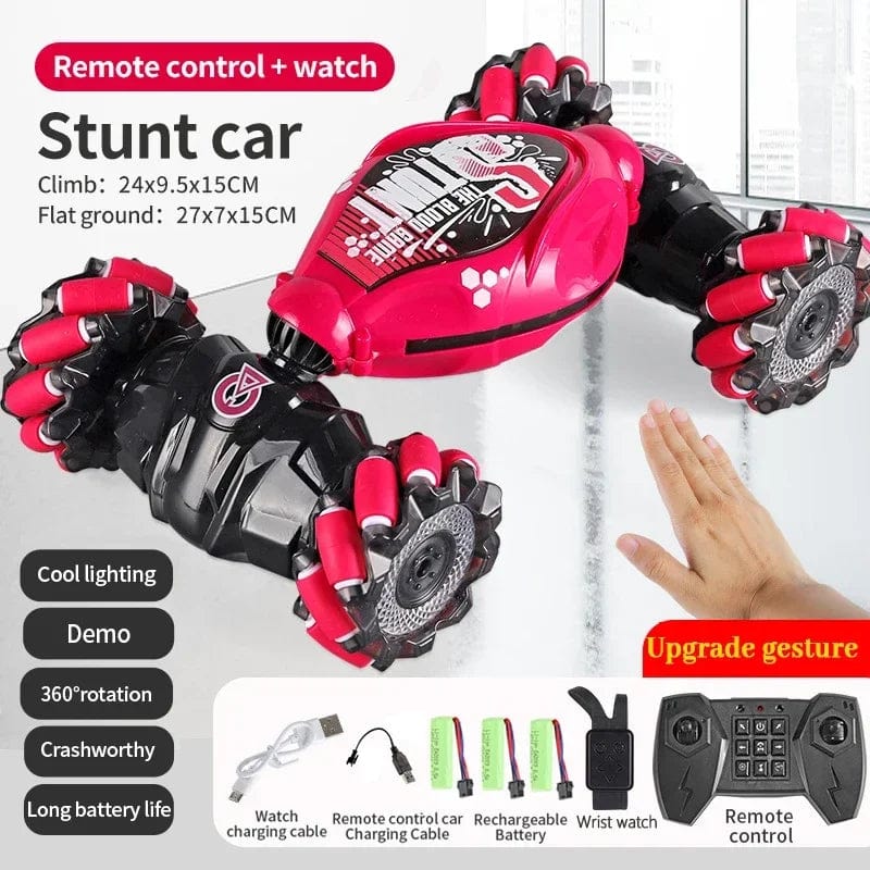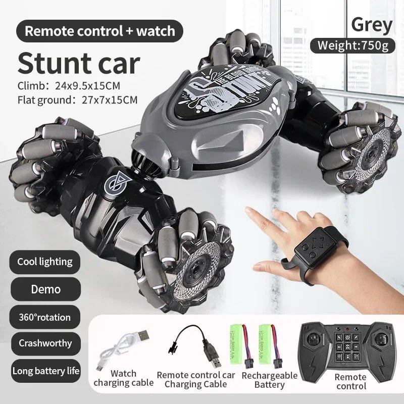 Our rc stunt car has been upgraded with two control modes: gravity sensor, watch and remote control. All you have to do is put on a gesture-sensing watch, make a gesture and the car will act accordingly. Or you can easily control the remote controller with the 2.4ghz transmitter strength, which is sensitive and responsive, and you can maneuver even from great distances. (You can't control a car toy in two directions at once.)