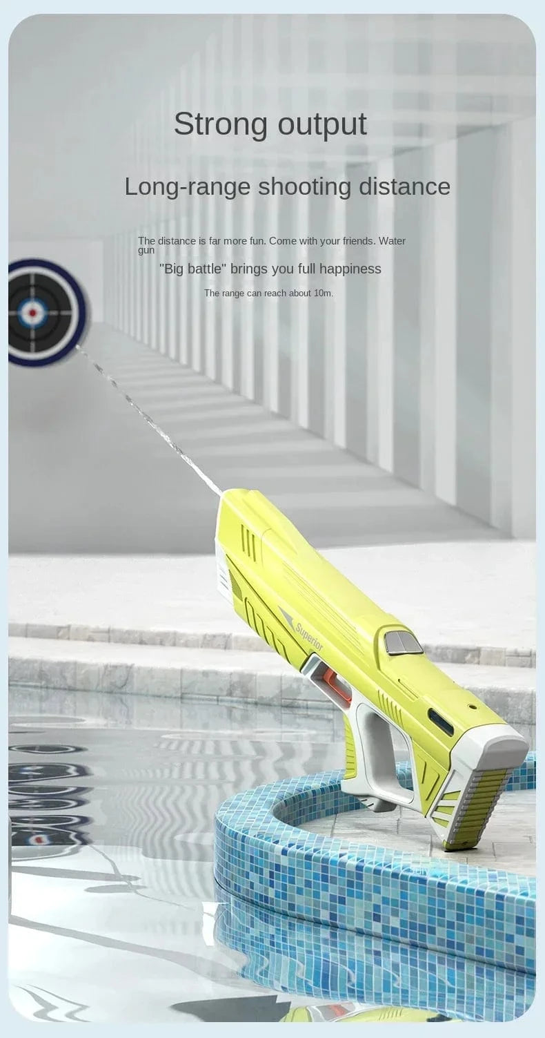 Avec une charge complète, la portée est de 8 à 10m, le pistolet à eau est rempli d'eau, il peut donc tirer environ 35 à 50 fois, et puis la batterie peut absorber de l'eau environ 4-5 fois, pour un total d'environ 200 coups.