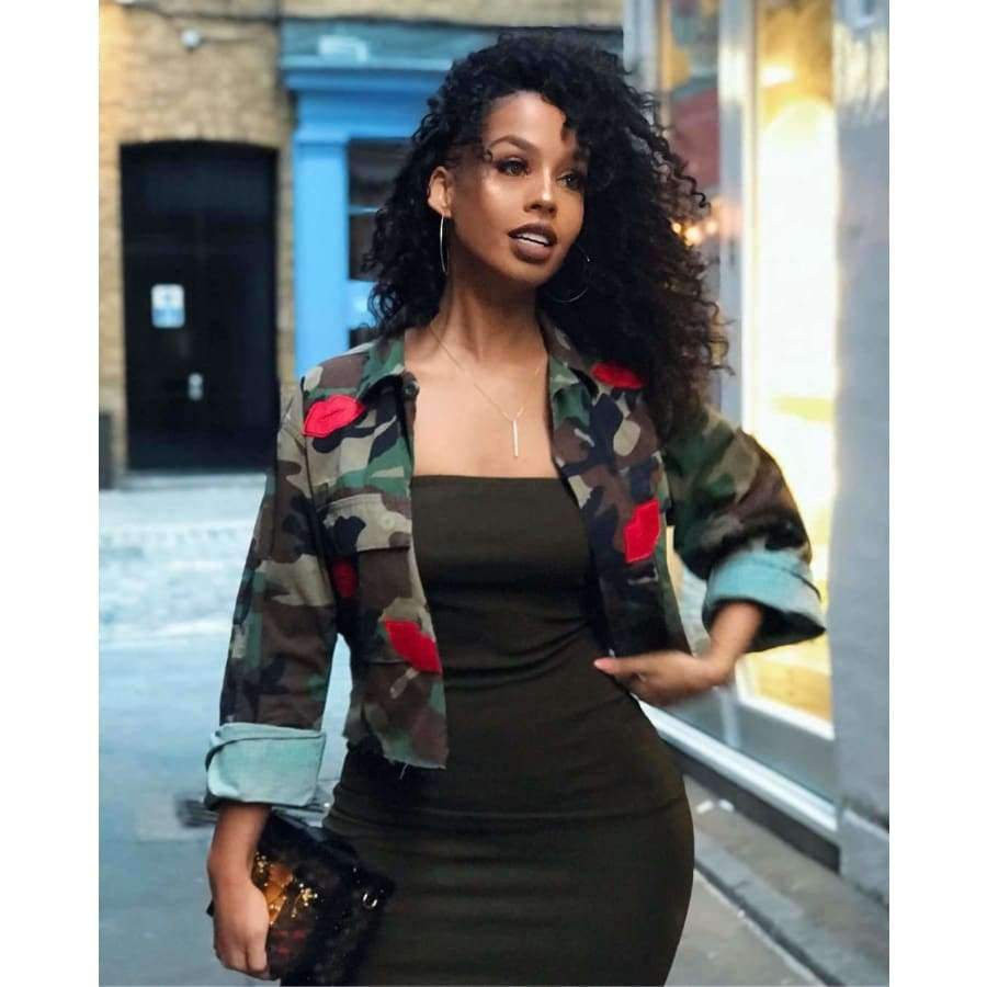Model Number: Lips embellished camouflage element shirt collar jacket