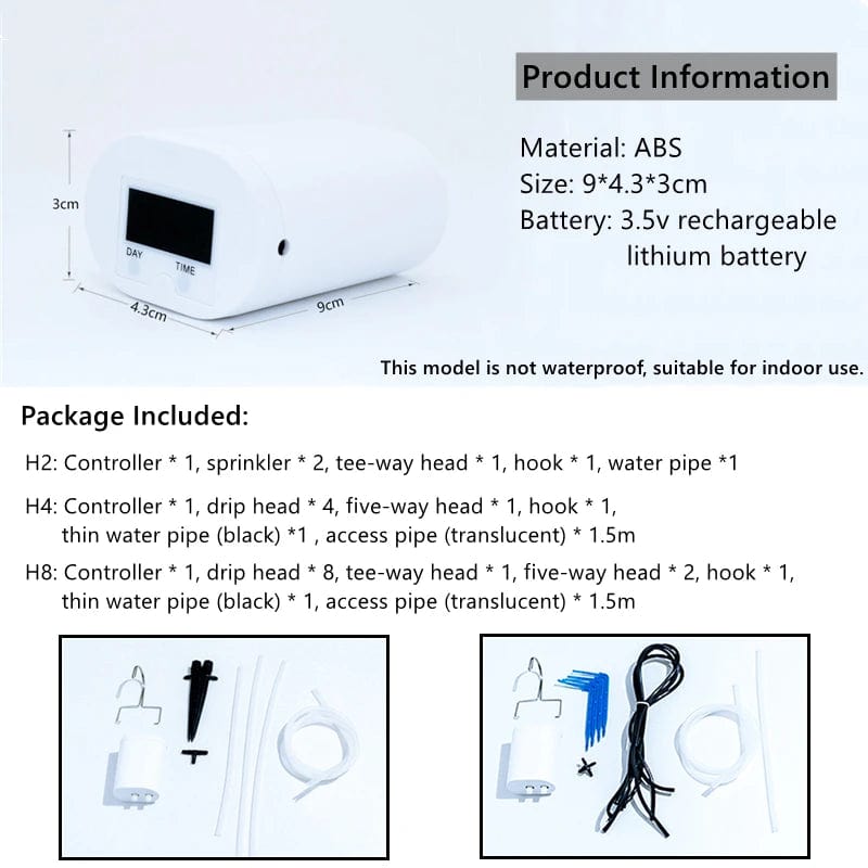 H4:Controller * 1, drip head * 4, five-way head * 1, hook * 1, thin water pipe (black) *1 , access pipe (translucent) * 1.5m
