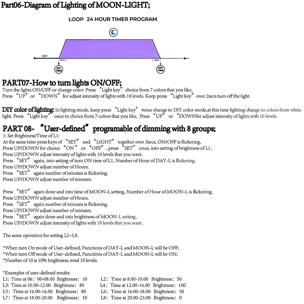 In Clock mode, use timer turn the light "ON'short press"SET KEY" once,"DAY-LON""SET KEY" over 3secis flickering at this time long pressto mode ofturn ON the light,"Hour" is flickering, press "up"or "DOWN" for choice the numberof"Hour" that you want. Press "SET KEY" again save and the number of "Minute" is flickering,press"up"or"DOWN"for choice the number of"Minute" that you want, Press "SET KEYdoneIn Clock mode use timer turn the light"OFF"SET KEY"over 3secshort press"SET KEY" twice,"DAY-L OFF is flickering at this time long pressto mode ofturn OFF the light,"Hour" is flickering, press"Up"or "DOWN"for choice the numberof"Hour" that you want. Press "SET KEY" again save and the number of "Minute" is flickering.press"Up" or"DOWN" for choice the number of"Minute" that you want, Press"SET KEYdone