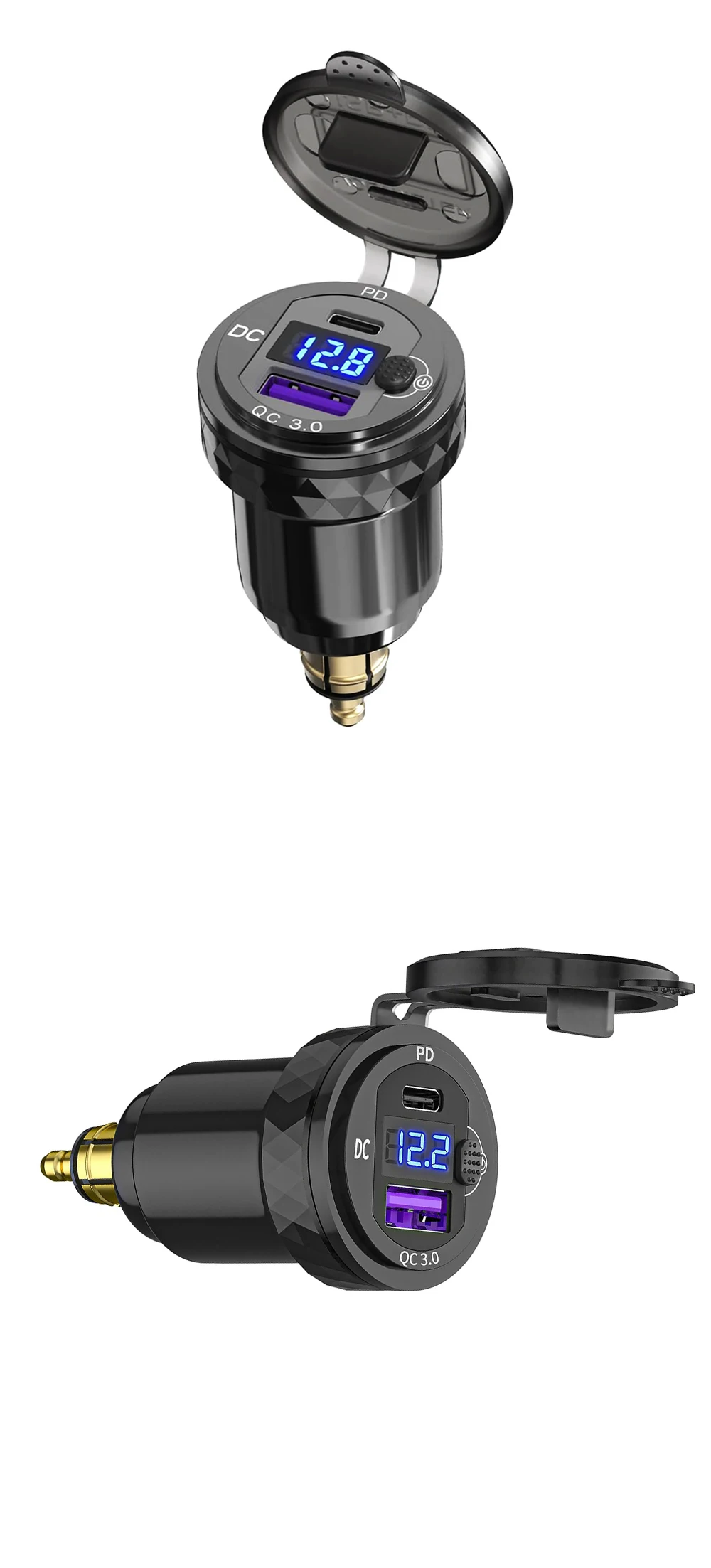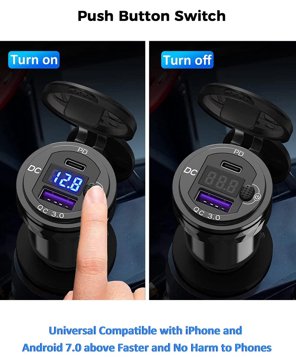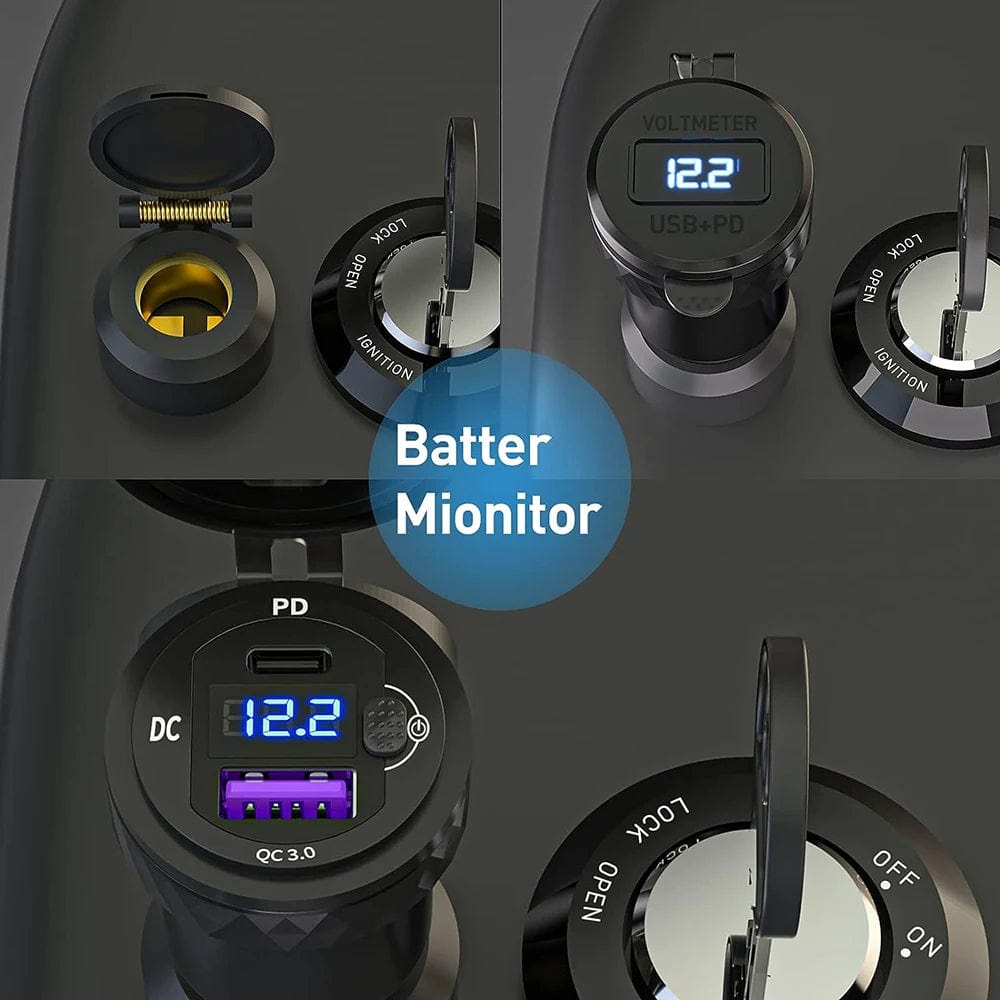 DIN Hella Plug 3.0 Dual USB Quick Charger Type C LED Digital Display Adapter Aluminum Alloy European Motorcycle USB Charger Din Socket Plug Power Outlet Voltmeter for BMW For Ducati For Triumph/Phone/iPhone/GPS/Satnav