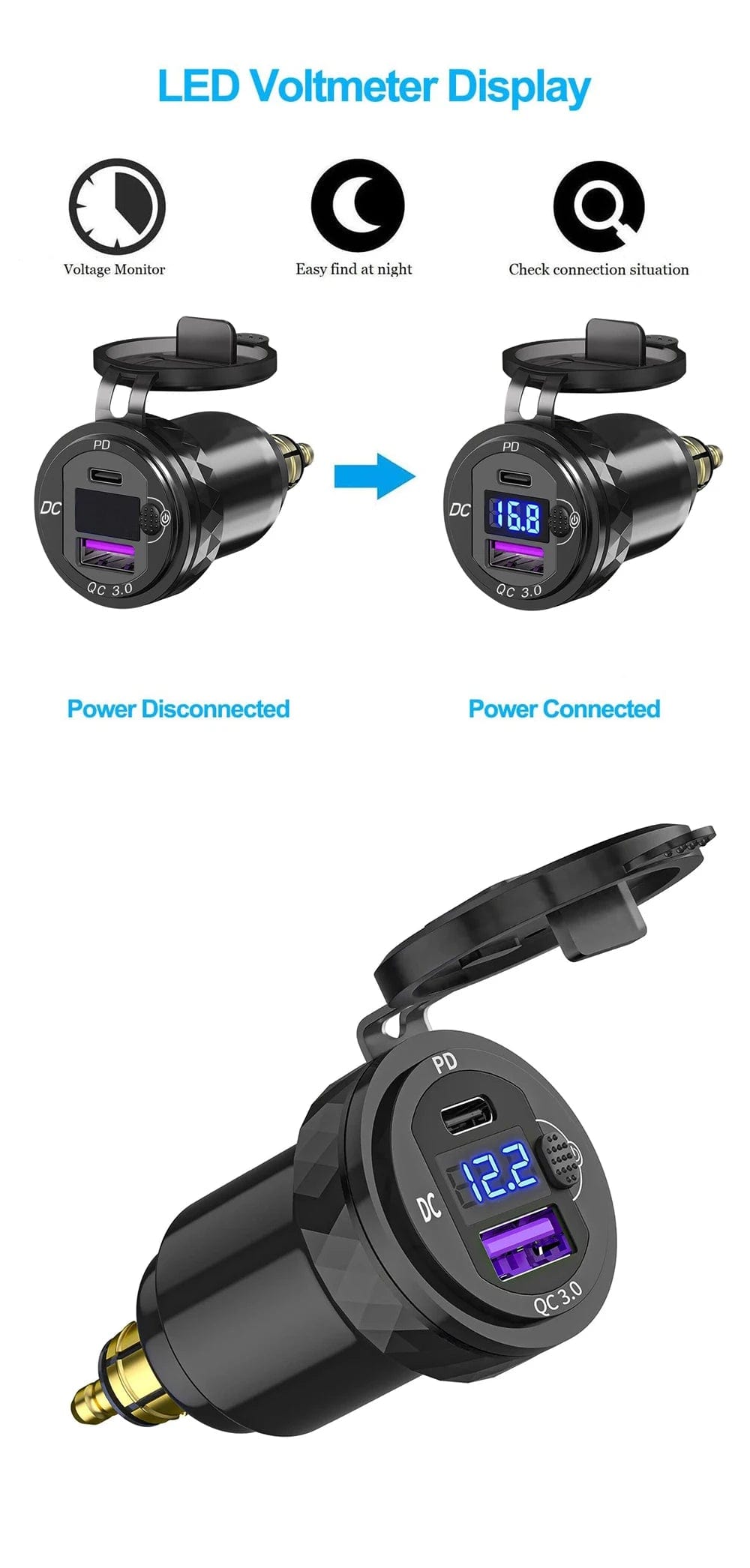 【Digital Voltmeter Display】- Built in intelligent voltage monitor, with LED digital display, it real time shows you the accurate voltage status of motorcycle, more secure for driving.