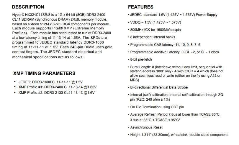 8GB 2400MHz 2PCS: HX324C11SR/8GBX2PCS