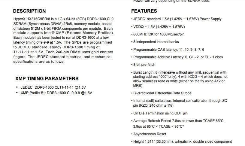 4GB 1600 MHz 2PCS: HX316C9SR/4GBX2PCS