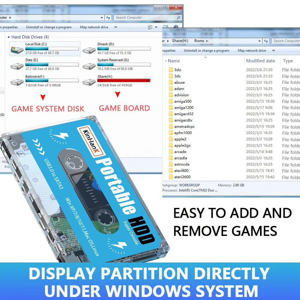 • High Storage Capacity :The KINHANK Super Console 500G Gaming HDD boasts a massive storage capacity of 500G, allowing you to store up to 100000 video games and 70 emulators.