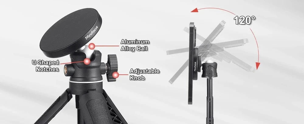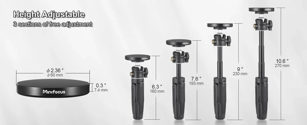 [Extendable Tripod] The extendable tripod can works as handle grip or selfie stick, 3 level extendable from 6.3"-10.6" (16.0cm-27.0cm), combined with 120° neck rotation and 360° head rotation, to find the best angle for shooting.