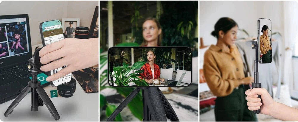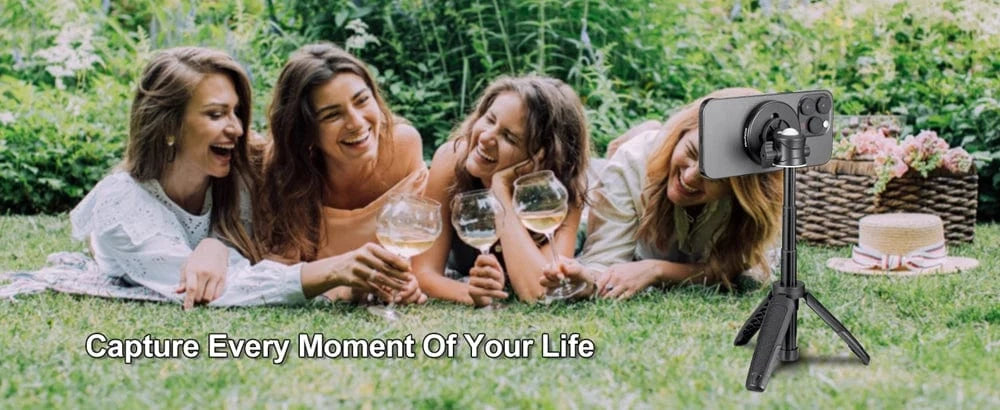 [One Hand & One Second Install] Different from traditional tripod holder, it's magnetic mount so you can put your phone on it with only one hand and one second. supporting horizontal and vertical screens and it can be adjusted 360° arbitrarily.