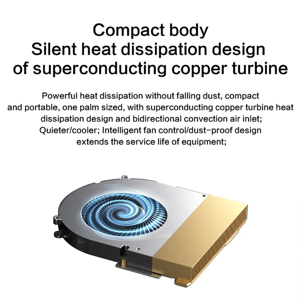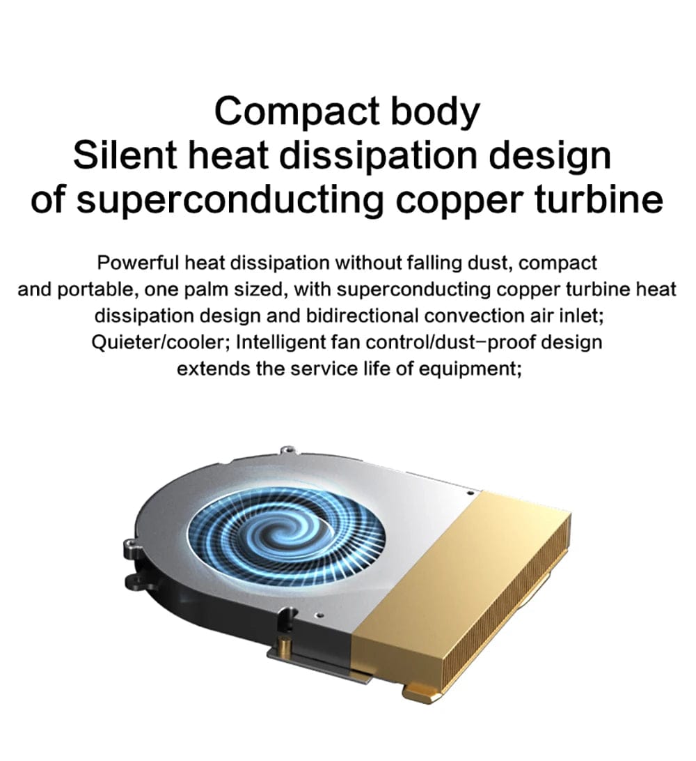 Powerful heat dissipation without falling dust, compact and portable, one palm sized, with superconducting copper turbine heat dissipation design and bidirectional convection air inlet;Quieter/cooler; Intelligent fan control/dust-proof design extends the service life of equipment;