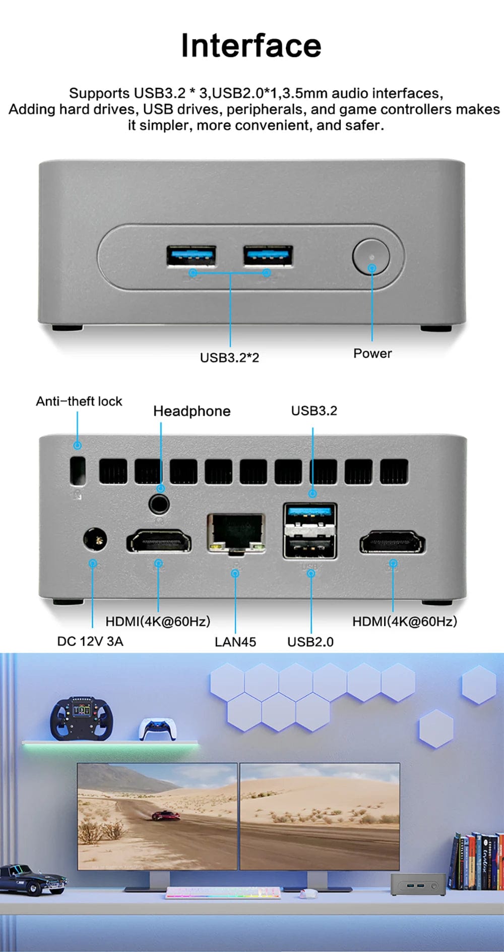 Supports USB3.2*3,USB2.0*1,3.5mm audio interfaces,Adding hard drives, USB drives, peripherals, and game controllers makes it simpler, more convenient, and safer.