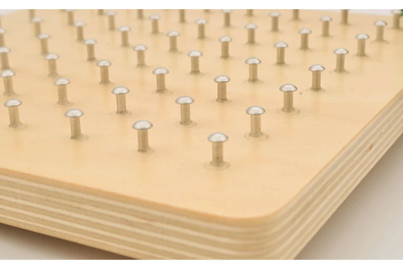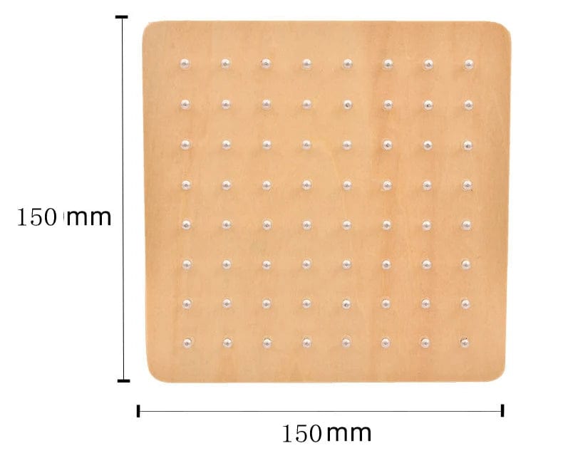 Geometrical Board: There are 1 wooden board with 64 pcs of nails half driven in, 23 pattern cards(5 empty cards & 18 geometric cards). The supply of two individual packages of latex band packs are more than enough. The board measures 15 x 15 x 2 cm