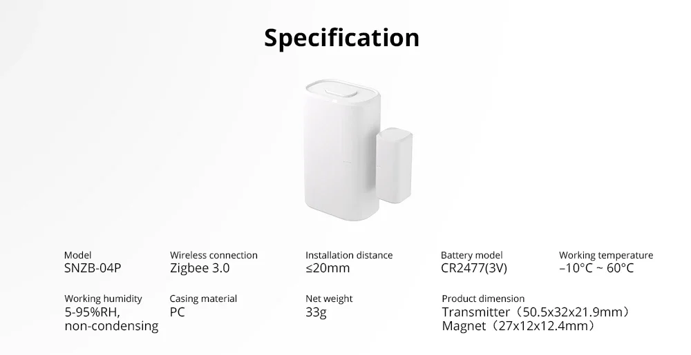 Compared with SNZB-04, SNZB-04P has improved design and performance. With a tamper alert, 5 years battery life, Maximum installation distance is 20mm, and the sensor on/off for more than a period can be used as a scene trigger condition.